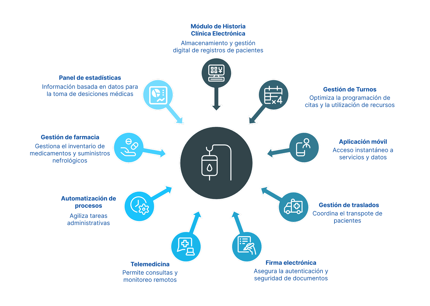 Digitaliza cada paso de la atención nefrológica. Desde la admisión hasta el seguimiento continuo del paciente, con una gestión clínica y operativa integral en una única plataforma cloud, segura y lista para tu día a día.