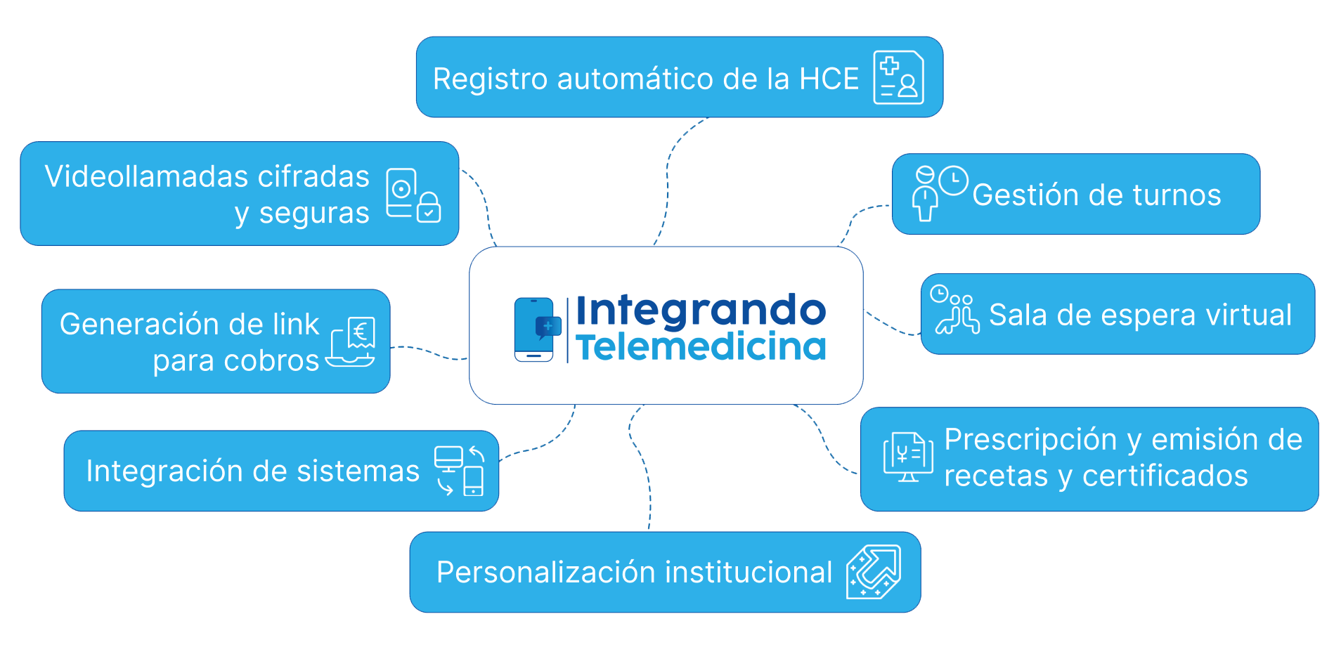 Videollamadas seguras desde navegador o app. Agenda médica y sala de espera virtual integradas. Registro clínico y recetas digitales en una sola plataforma. Recordatorios automáticos por WhatsApp y email. Ahorro de tiempo y mayor continuidad en la atención. Mejora la experiencia del paciente y amplía tu cobertura médica. Sin instalaciones, 100% online y escalable. Infraestructura completa que brinda todas las herramientas necesarias en un solo lugar.